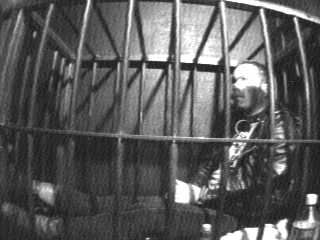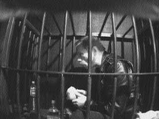 Prisoner Bob flew in to Oakland Airport Friday afternoon. He was picked arrested on the spot and immediately cuffed with hinged cuffs behind his back. He was driven to the Blacksteel dungeon in San Francisco. On the way his balls were repeatedly "bumped" in order to assure him who was, and more to the point who wasn't, in control. Upon arrivel he was locked into the cage for the rest of the afternoon.