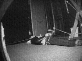 12 Hours later. The prisoner was awakend and his bondage increased. His wrists are now chained to the top of the cage while his ankles are chained to the front. He cannot but wiggle in his discomfort.