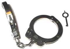 These handcuffs are made by Hiatts of England. They are model 2010C and are unusual because there is a metal plug held in place by two rivits in the bow of the handcuff. This plug prevents the locking arm from going around and adds strength and weight to the cuff.