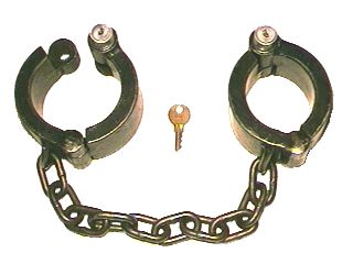 Typical shackle-style handcuffs, these are very heavy (12 lbs.!). They use push-to-lock multi-bit cylinder locks. The connecting chain is quite long (12" or so). The chain can, of course, be locked to anything. Sized to fit small to medium wrists.