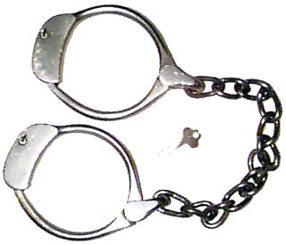Lovell legirons, produced under license from the Bean Company. Rarer than the similar Bean legirons, distinguished from the Beans by the rotating dustcover at the keyhole.