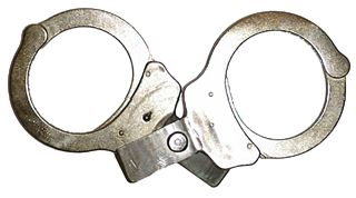 A prototype made by Securitech. They are made of regular peerless handcuffs to which a bar has been welded in place of the chain. The bars on each cuff are connected by a swivel joint. The bars will cover the keyhold when applied and make escape more difficult.