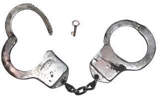 Strauss Engineering (Atlanta, Georgia (?)) must have been a major supplier of leg irons to the military, as their products are very common in flea markets and antique shows. Much rarer is the Strauss handcuff shown here, which uses the same flat key as the leg irons.